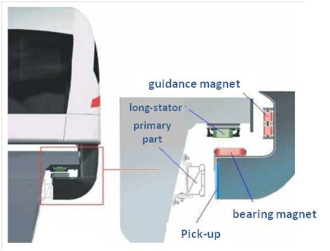 Recent developments suggest a reduction of the high voltage level in the propulsion system from previously 2-10 kV to a voltage level between 400-900 V along the line, with a frequency of 50 Hz [3]. The power is transmitted along propulsion sections of the guide way. Substations switch the power only in that section in which a vehicle is moving. Other sections are switched off and free of power. Fields are generated by the bearing system, the guidance and the linear drive system. The structure of the TR08 system is illustrated in Fig. 3.