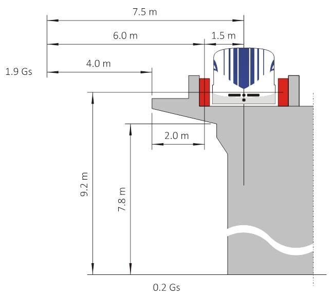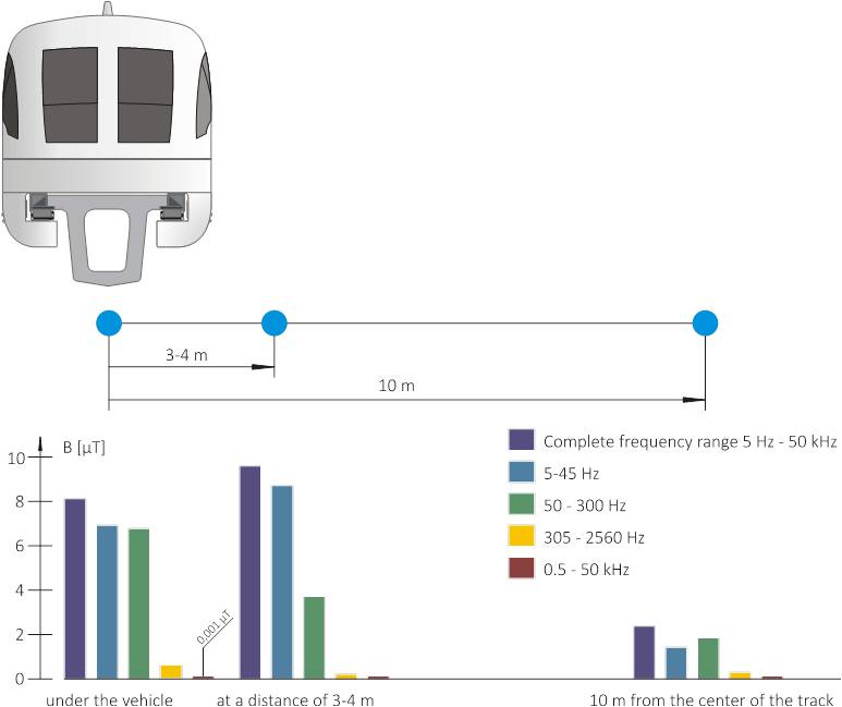 The magnetic field or induction and its frequency dependence along the track is shown in Fig. 3a. The induction is lower than 10 µT, even very close to the guideway. There is no impact to be expected for residential areas. The reason for the low induction values is the small gap between the bearing and the guidance magnets and the stator coils in the vehicle. This drastically reduces the stray fields outside the guideway.