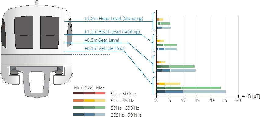 Method: To estimate the impact on passengers, the field contributions generated by the power supply system as well as by the drive and suspension systems are taken into account. For the comparison, the peak values of the electromagnetic fields have been considered.