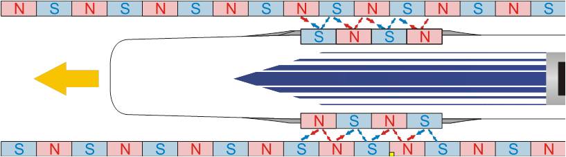 Inside the motor windings, alternating current generates a magnetic traveling field which moves the vehicle without contact. The support magnets in the vehicle function as the excitation portion (rotor). The respective magnetic traveling field works in only one direction, and therefore makes moving train collisions less likely, as more than one train on the track section would travel in the same direction.