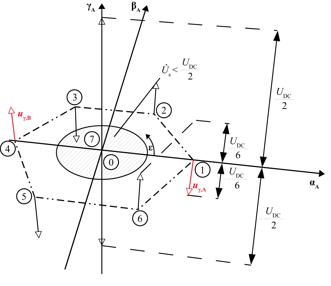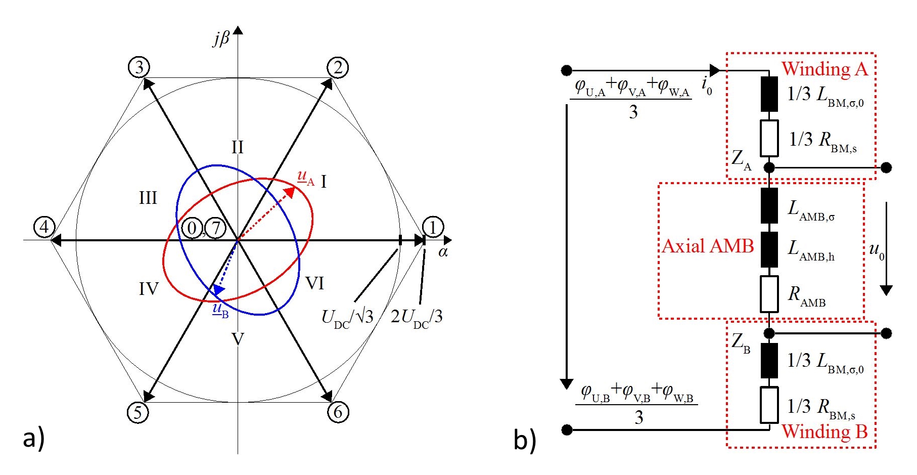 The proposed technique relies on a conventional space vector pulse width modulation (SVPWM) [3]. That means, that for each of the elliptical three-phase current systems IA and IB a current controller determines a certain voltage space vector in the stator-fixed coordinate systems (αA-βA and αB-βB). This voltage requirement depends solely on the torque and radial suspension force requirement, whereas the axial force requirement is introduced at a later state. The amplitude of the applied phase voltages and which in the case of a symmetrical voltage system is equal to the length of the voltage space vectors uA and uB is limited by the hexagon in Fig. 2a. In this case, due to the superposition of the clockwise and counter-clockwise voltage system, the main axes of the ellipses determine the inverter voltage rating. These main axes are determined by the algebraic sum of the required clockwise and counter-clockwise rotating voltage space vectors for torque and lateral force generation. However, since the 2p-pole rotor field does not induce into the imaginary 2psus-pole suspension winding, the voltage trajectory is only slightly elliptical, so that mainly the back-EMF of the 2p-pole rotor field determines the voltage requirement as in common rotating field machines.