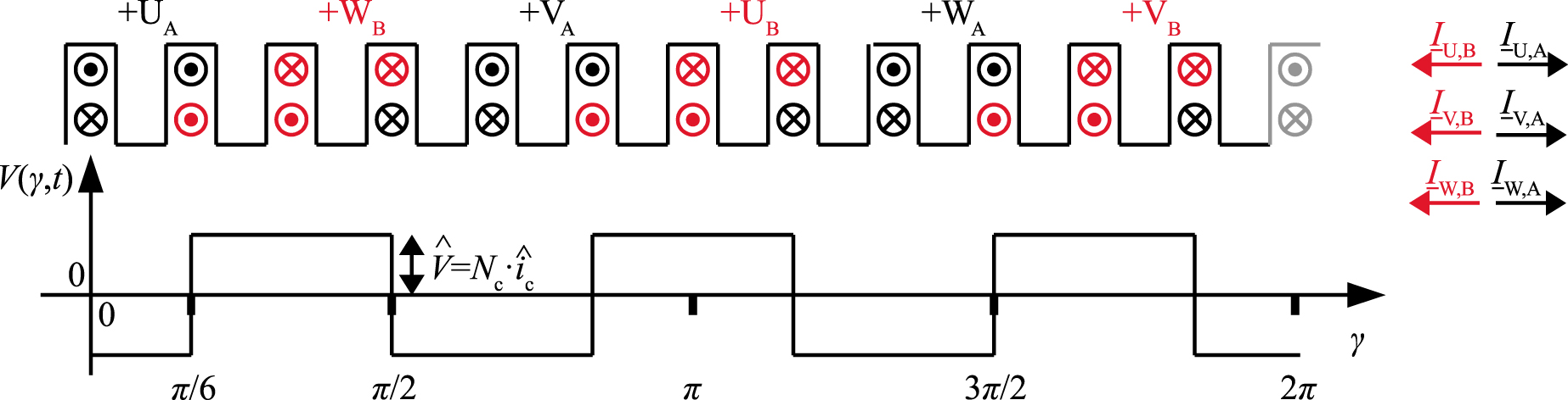 If the two windings A and B are fed by a DC current as described above the M.M.F. distribution V(γ,t) normal to the stator surface for the considered PM synchronous machine results as to see in Fig. 3. It is important to note that the current through the axial AMB is only one third in each phase, following Kirchhoff’s law (see Fig. 2 b)). From that it can be concluded that, aside from the symmetrical three-phase systems icw and iccw, the zero-sequence component i0(t) introduces field harmonics of order ν = 3, 9, 15, … according to (9). This field distribution does not move but is constant if i0 is constant and pulsates with fax if i0 is sinusoidal and fax-frequent.