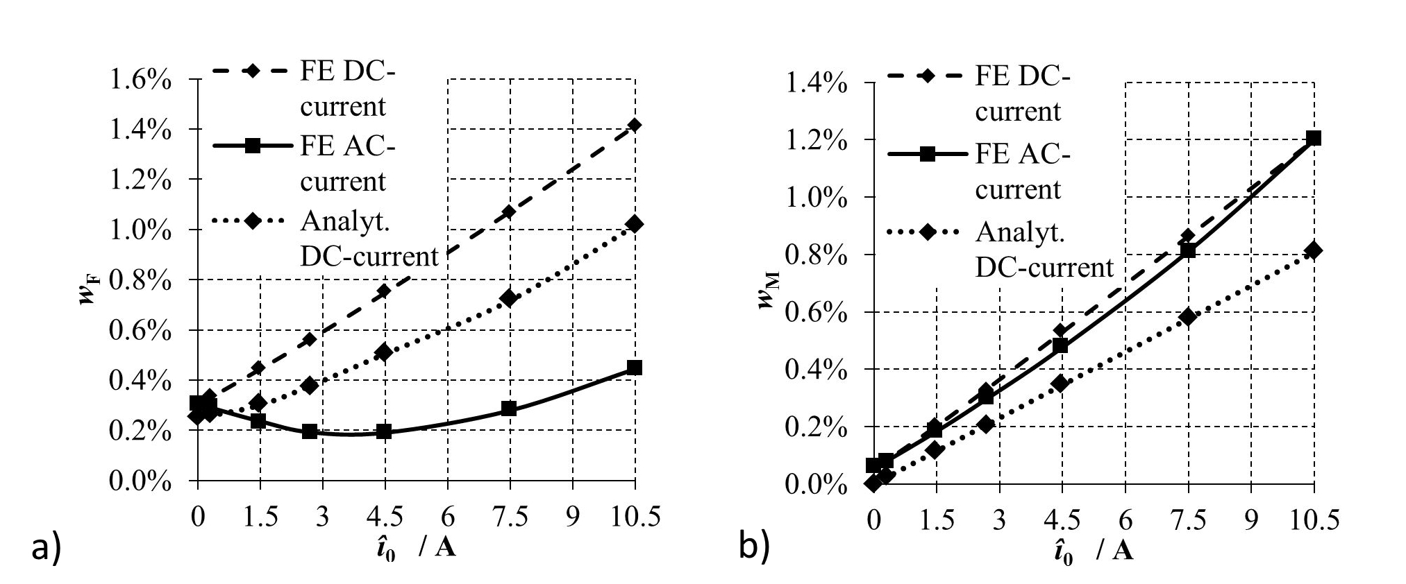 From (10) the torque coefficients Mi can be calculated according to (11). From that, the low influence of a zero-sequence feeding can be seen. Equation (11) is valid for m = 3 phases. The analytical result (Analyt. DC-current) for the third harmonic current ripple is proved at rated operation by the FE simulation (FE DC-current) results from Fig. 4b.