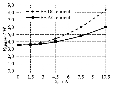 Fig. 5. Calculated eddy current losses Pd,Ft,PM in the permanent magnets for different zero-sequence current feedings at rated operation (nN = 60000 min-1, MN = 105 mNm) from 2D FE simulations (JMAG); other operating points show similar characteristics