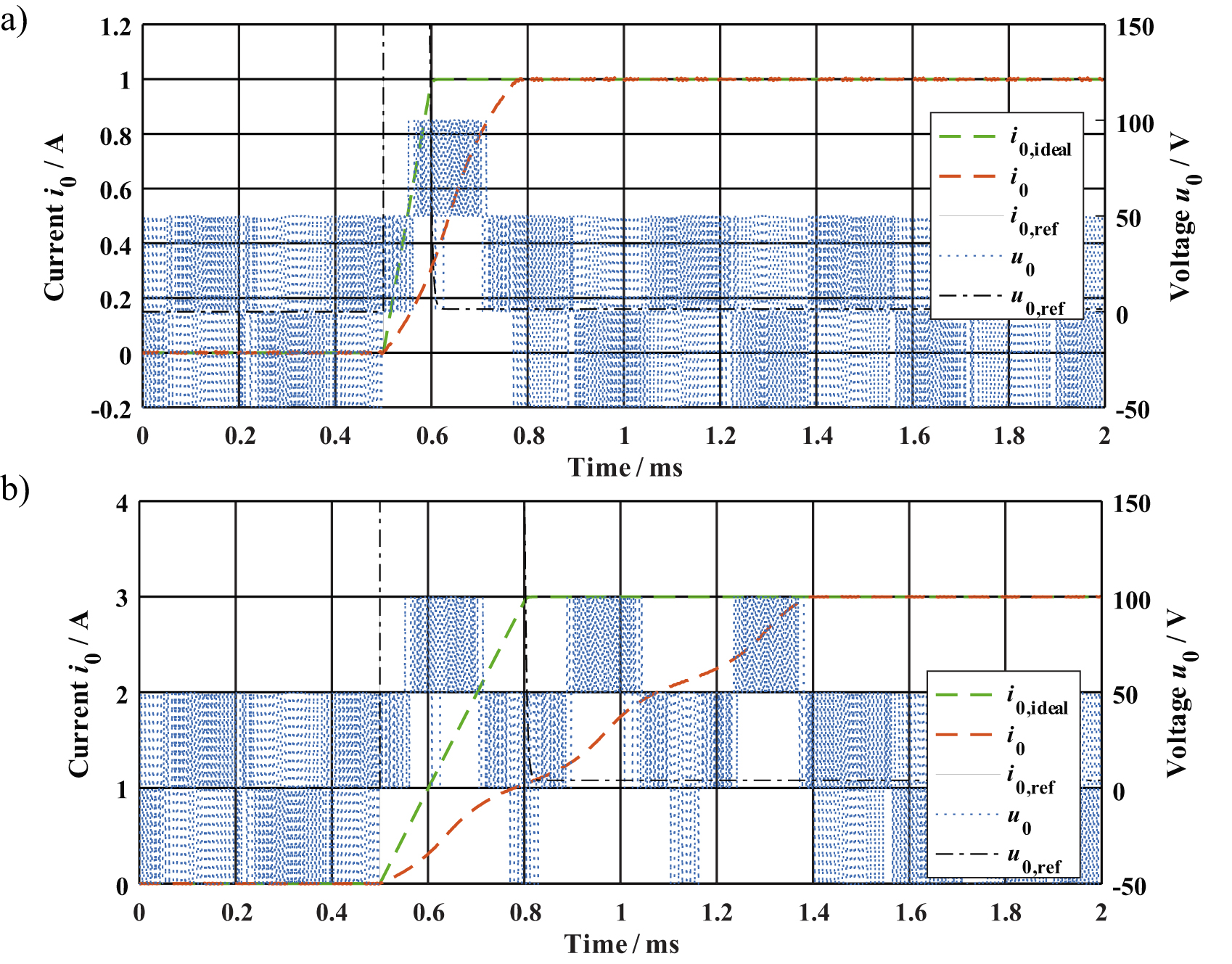 In Fig. 6a it can be seen that current follows within 0.3 ms in comparison with the ideal case where the current follows within 0.1 ms. In this scenario the inverter shows the well-known lack element behavior. For a reference step of i0,ref = 3 A (Fig. 6b) the current follows within 0.9 ms which is again three times the time span of the pure DC voltage feeding. Further, the non-linear behavior which results from the zero-voltage time span calculation can be seen. However, it is already can be shown that the disturbing effect of the inverter on the controller circuit is acceptable for current requirements i0 < 1 A.