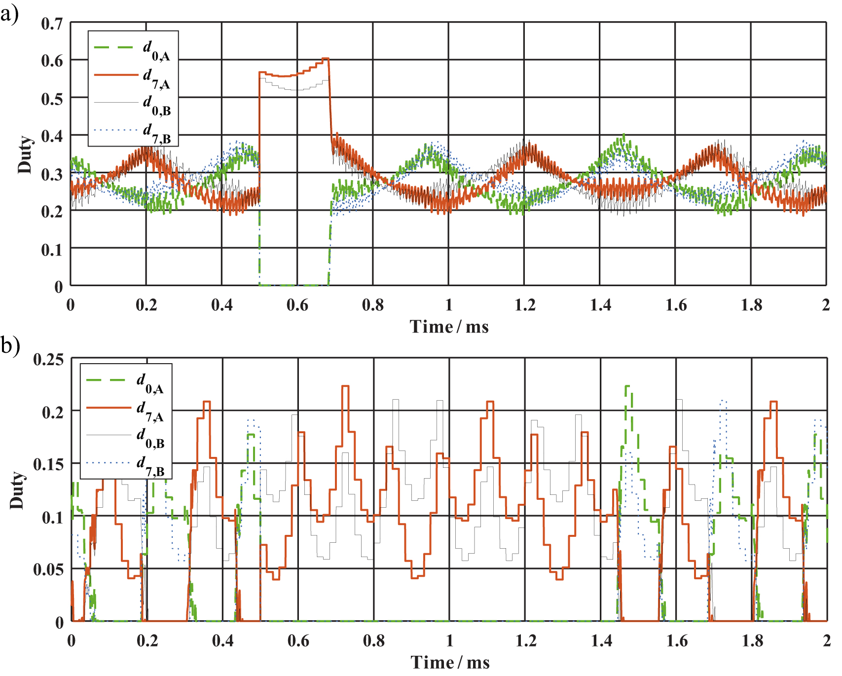 Fig. 7. Simulated zero-voltage duty states d0,A, d7,A, d0,B, d7,B, for a reference current step of i0,ref =1 A at 0.5 ms at rated suspension operation (ûccw = 3.2 V, îccw = 3.2 A) and different modulation degrees: a – ûcw = 40 V (ma = 0.5, n ≈ 40000 min-1);b – ûcw = 80 V (ma = 0.96, n ≈ 80000 min-1)