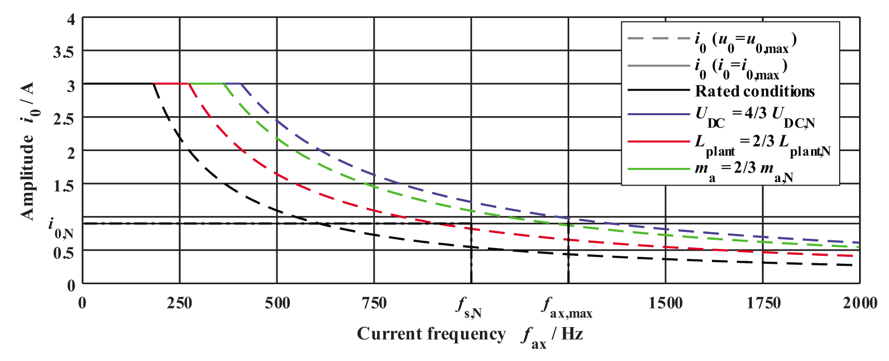 In the previous section, it was shown that the slew rate of the current is limited by the inverter voltage rating. This results in a limited operating frequency range for the system: At low frequency, e.g. i0 = const., the tolerance of the zero-sequence current in the bearingless motor limits the operation in terms of maximum axial force generation (solid lines in Fig. 9). At high frequency, however, the inverter voltage rating (together with the given time constant of the plant) limits the operation (dashed line in Fig. 9). That is, the current cannot follow the reference signal anymore. If the voltage drop over the plant resistance Rplant is neglected the relation between bearing current and required voltage is given by (16) according to [1]. Here, fax is the bearing current frequency and Lplant is the bearing and motor inductance of the circuit.
