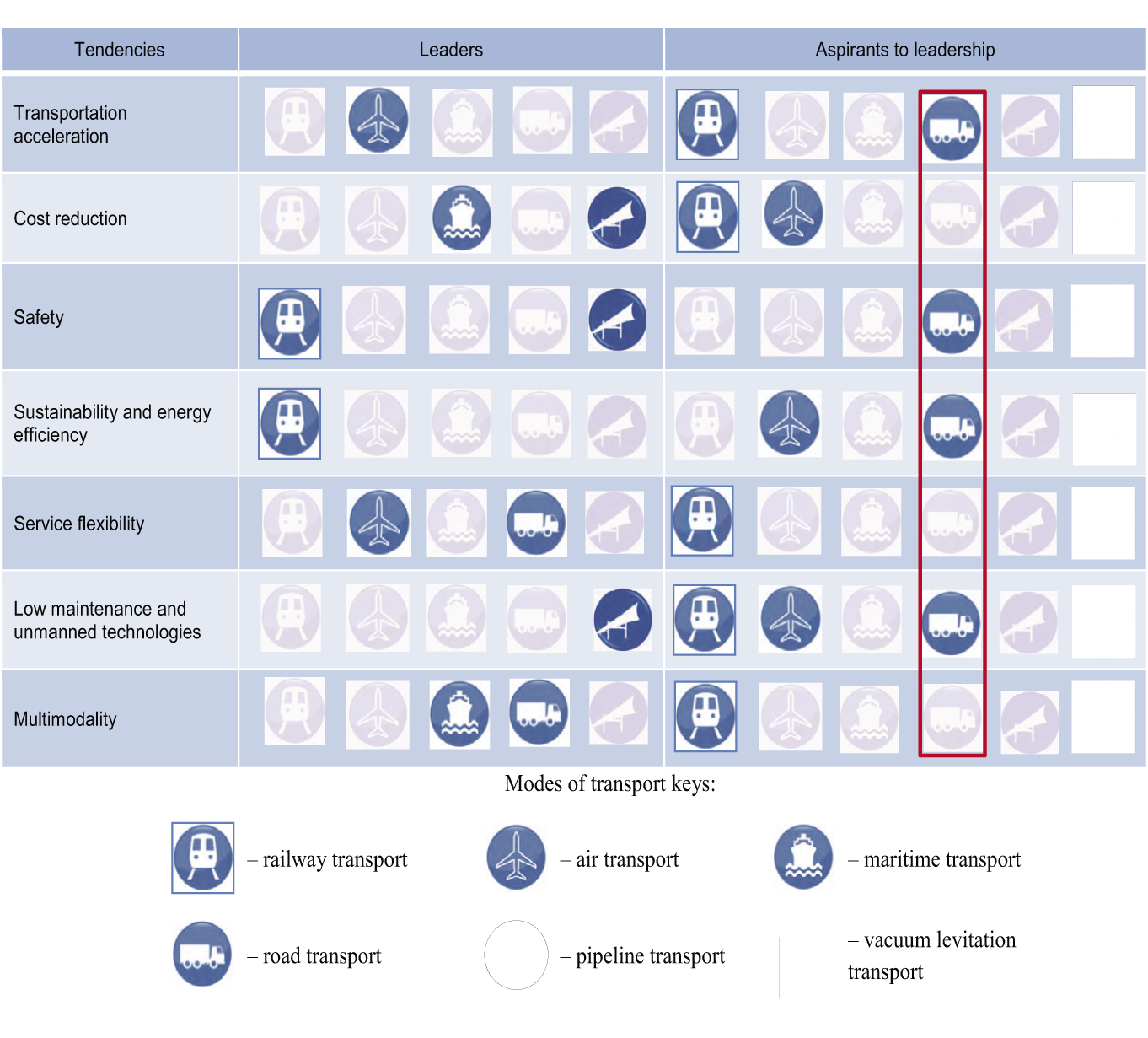 На Рис. 1 показаны современные виды транспорта, которые сегодня лидируют или стремятся к лидерству на транспортном рынке. В плане безопасности, в частности экологической, и энергоэффективности первым выступает железнодорожный транспорт, по другим позициям лидируют автомобильный, трубопроводный, авиационный, морской транспорт. Стратегическим «ориентиром» железных дорог служат увеличение гибкости обслуживания, обеспечение мультимодальности и ускорение перевозок. Вместе с тем эти стратегические тренды самым активным образом развиваются на автомобильном транспорте, который стремится к лидерству в растущем сегменте требований общества к транспортным услугам.