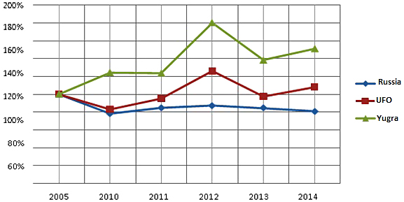 Если объемы перевезенных грузов в 2014 году относительно 2005 года по УФО практически сохранились, а по России даже уменьшились, то по автономному округу они значительно возросли, что характеризует рост интенсивности движения автотранспорта и нагрузок на автомобильные дороги (рис.1).