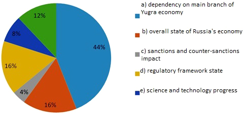 Для выявления преобладающих трендов в транспорте, нами был проведен анкетный опрос организаций, имеющих отношение к данной отрасли в Югре. Данная методика была опробована в предыдущей работе автора исследования [12]. Всего в опросе приняло участие 15 организаций, которые непосредственно осуществляют деятельность в транспортной отрасли. В анкетировании принимали участие респонденты, работающие в большинстве видов транспорта региона, за исключением трубопроводного и железнодорожного, но преимущественно в самом распространенном – автомобильном (86,7 %). Анкетный опрос охватил респондентов из различных городов региона: Нижневартовск, Ханты-Мансийск, Советский, Югорск, Нягань, Урай, Лангепас, Урай, Мегион, с преобладанием ответов из столичного города. В основном среди респондентов преобладают представители среднего бизнеса – 54 %, затем мелкого – 31 % и крупного – по 15 %, были опрошены и представители как очень крупного, так и очень мелкого бизнеса. Среди опрошенных были и респонденты, имеющие косвенное отношение к транспортной отрасли. Среди них на долю заказчиков транспортных услуг приходится 50 % опрошенных, на поставщиков – 17 % респондентов, остальные оказывают различные услуги транспортной отрасли. Преобладающий возраст ведения бизнеса респондентов составляет: промежуток от 3 до 10 лет – 34 %, от 1 до 3 лет и на стадии становления – по 25 %, от 10 до 20 лет и более 20 лет – по 8 %. На непосредственных исполнителей приходится 31 % опрошенных, на менеджеров среднего звена – 46 % респондентов, остальные – владельцы собственного бизнеса. Большинство опрошенных (60 %) считают, что в последние годы в Югре сложились устойчивые тренды в развитии различных подотраслей транспортной отрасли. Часть респондентов (13,3 %) считает, что такие тренды не сложились, и часть считает, что выявить такие тренды затруднительно (26,7 %).