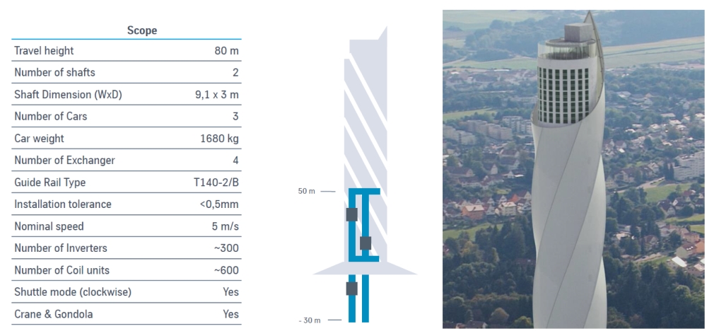 Background: The world’s first linear motor driven passenger elevator system MULTI® started test operation at test tower Rottweil, Germany. A full scale showcase has been installed, the commissioning is finished and extensive testing activities are performed. The new test tower in Rottweil provides the perfect test and certification environment to get this ground-breaking product onto the market.