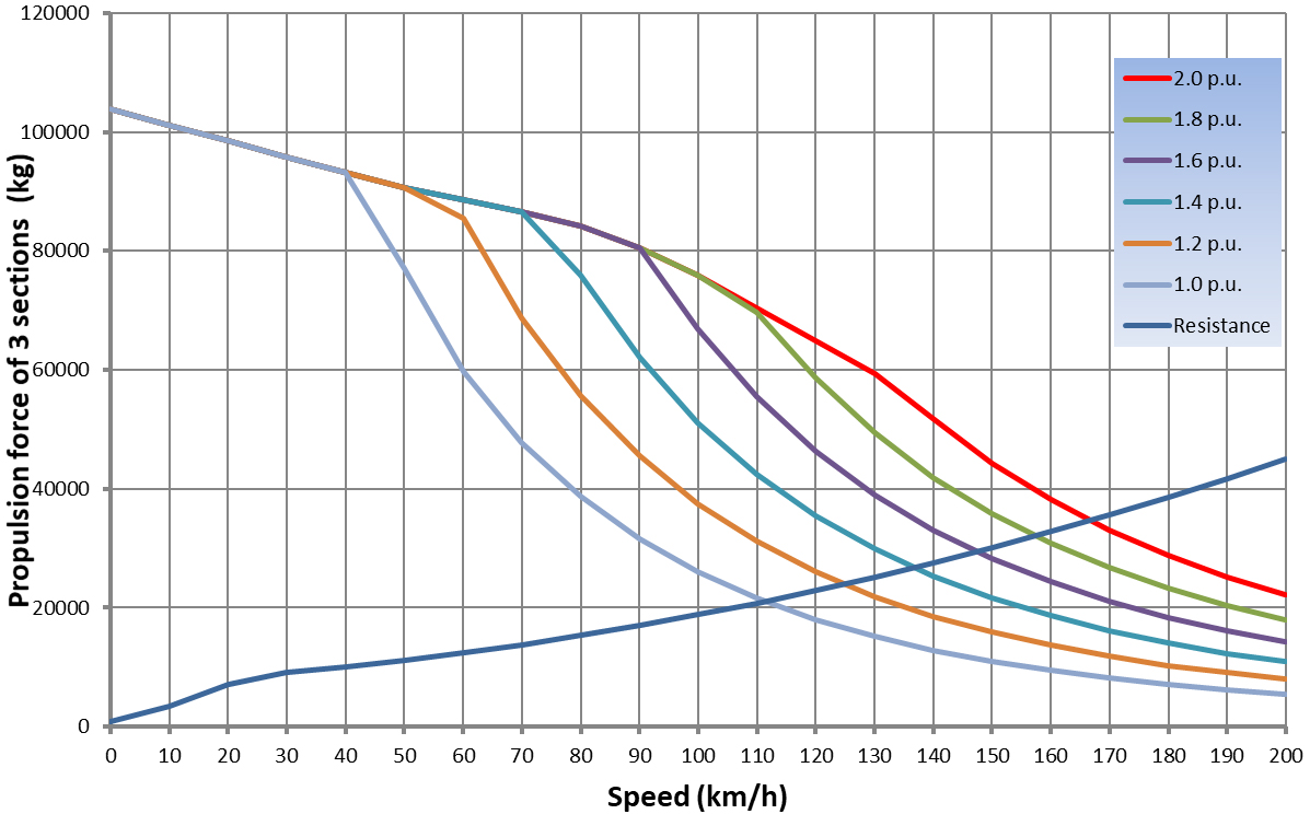 Acceleration ability is also an important performance index. To indicate the acceleration ability, we assumed that vehicle running at a straight line without any turning curves and slopes, then record the distances and times when vehicle get the maximum speed, the results are listed in Table 3. When taking the look at 2.0 pu condition column, although the goal speed of 160 km/h is achieved, the acceleration distance is about 2.5 km, it’s too long if the station spacing is less than 5 km. Furthermore, there must be some speed limitations when applied to actual running line with smaller radius curves and slopes, the acceleration distance would surely be much longer than figures in Table 3.