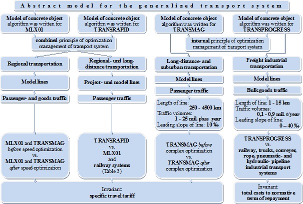 For TRANSPROGRESS, a abstract model of a generalized transport system was chosen. The method of calculation of the technical-economic indices [12] and preliminary optimization [13] were utilized. The technical-economic indices of other compared traditional industrial transport systems were executed via the methods of [14–15].