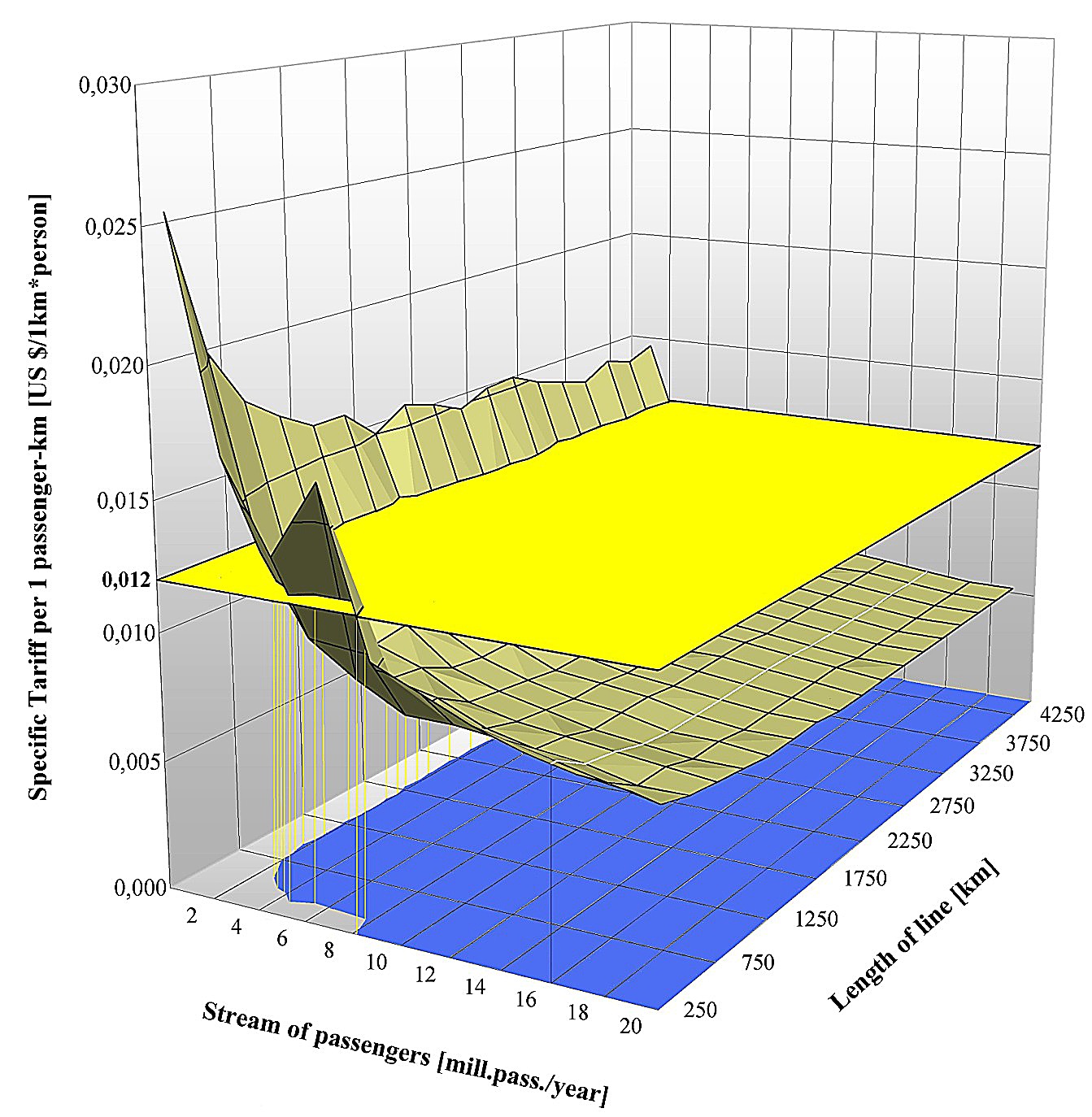 The area, characterizes by the specific travel tariff of the Ukrainian high speed train (1/2 U.S. Cent per personkm), limits the scope of the effective application of TRANSMAG by the largest annual passenger traffic (Fig. 6, 7). By the optimization model of TRANSMAG, this low boundary moved up from 15–17 to 3–9.5 million passengers per year (Table 2) and thus two and half times enlarges the scope of its effective application.