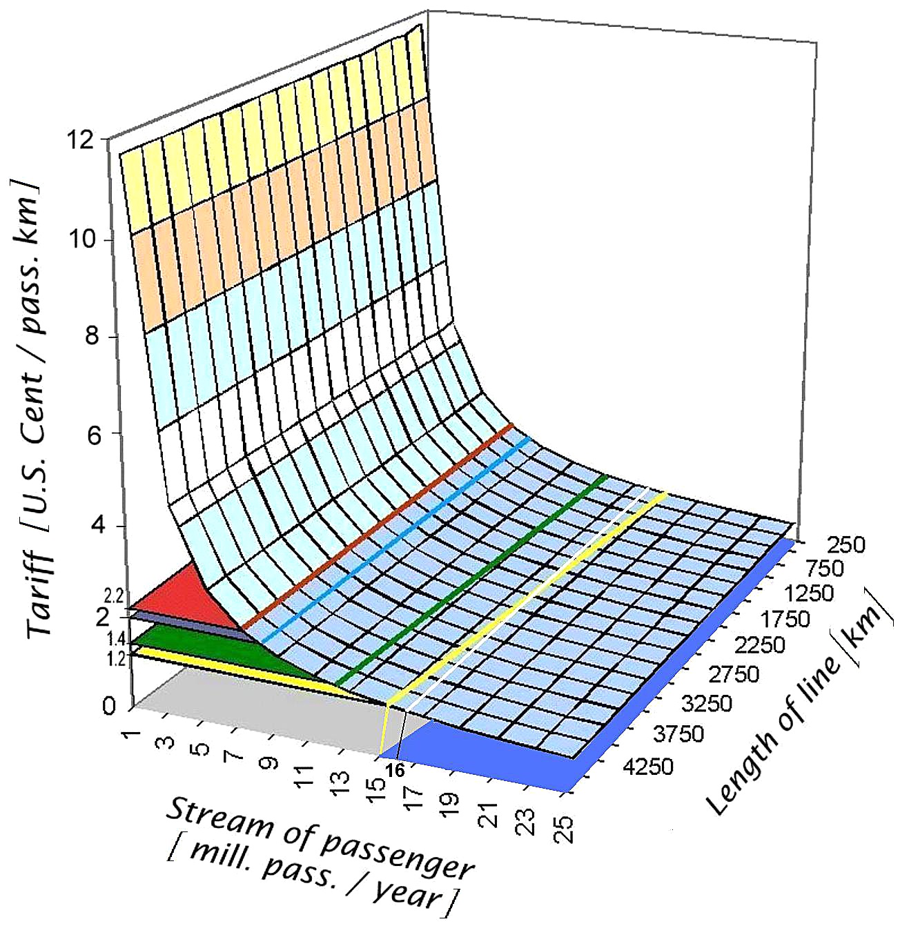 Range of tariffs at the set volume of annual traffic depending on length of line | U.S. Cent per personkm | 1.1–1.3 | 0.8–0.53 | ||