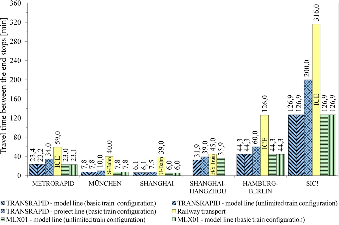 Calculations of TRANSRAPID and MLX01 performed for the selected model lines and for lines in operation as described in Table 1.
