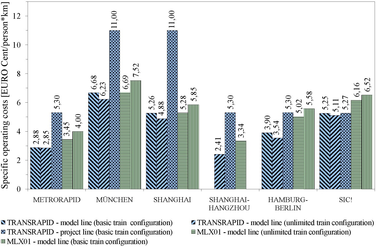The calculations were performed for four Maglevsystems:, TRANSMAG and TRANSPROGRESS as well as TRANSRAPID and MLX01.