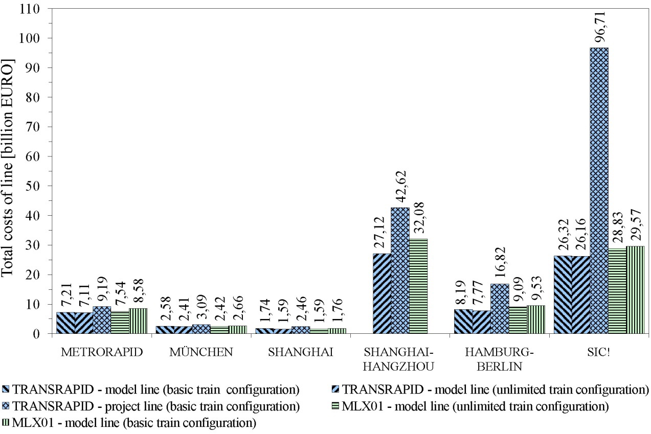 At the same time the limits of scopes of the application of TRANSRAPID and MLX01 were determined (Fig. 5).