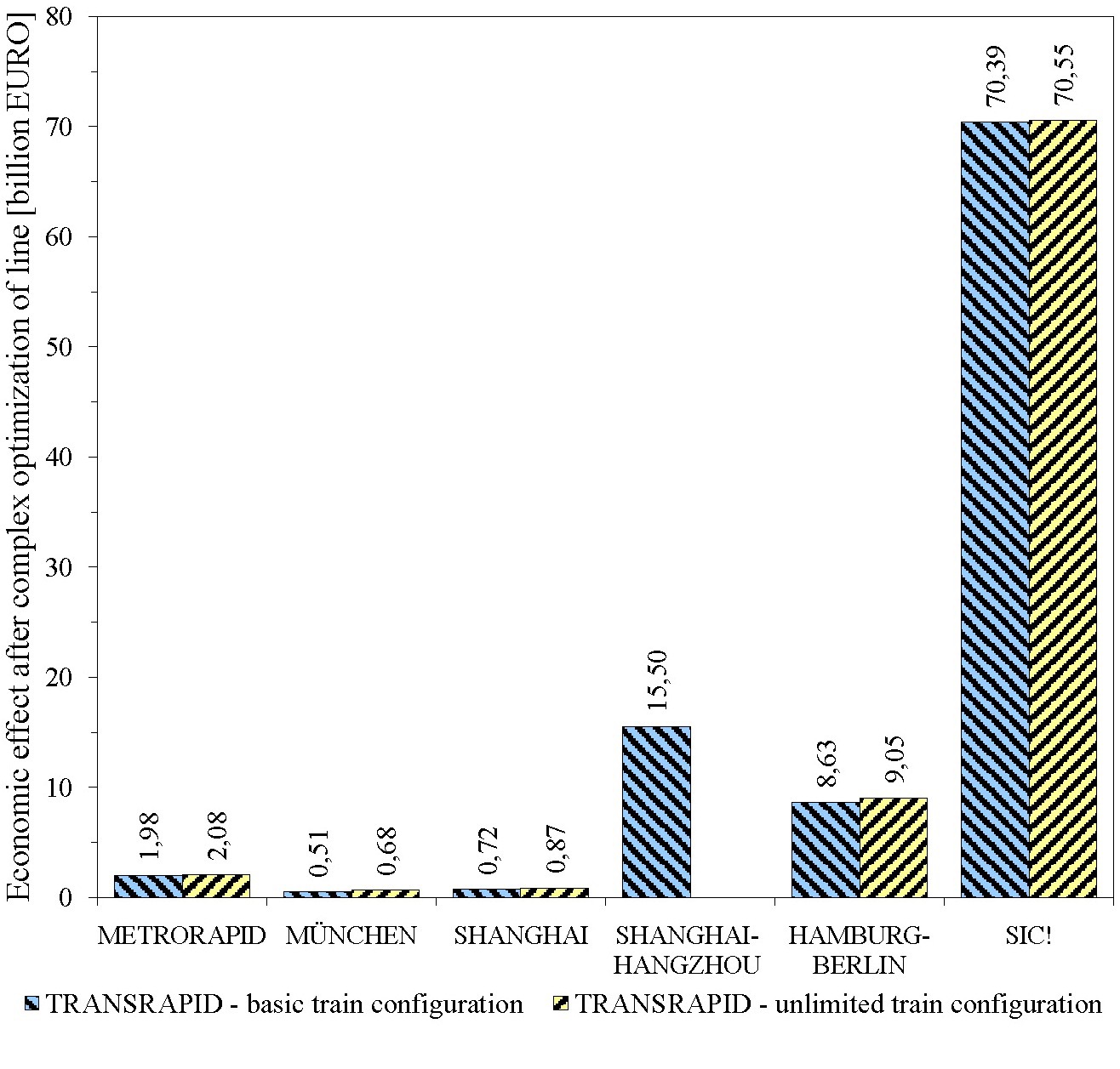 The optimization model showed that, in parallel with the increase in speed performance, economic efficiency of the TRANSRAPID has increased on one third compared to its design data (Fig. 14).