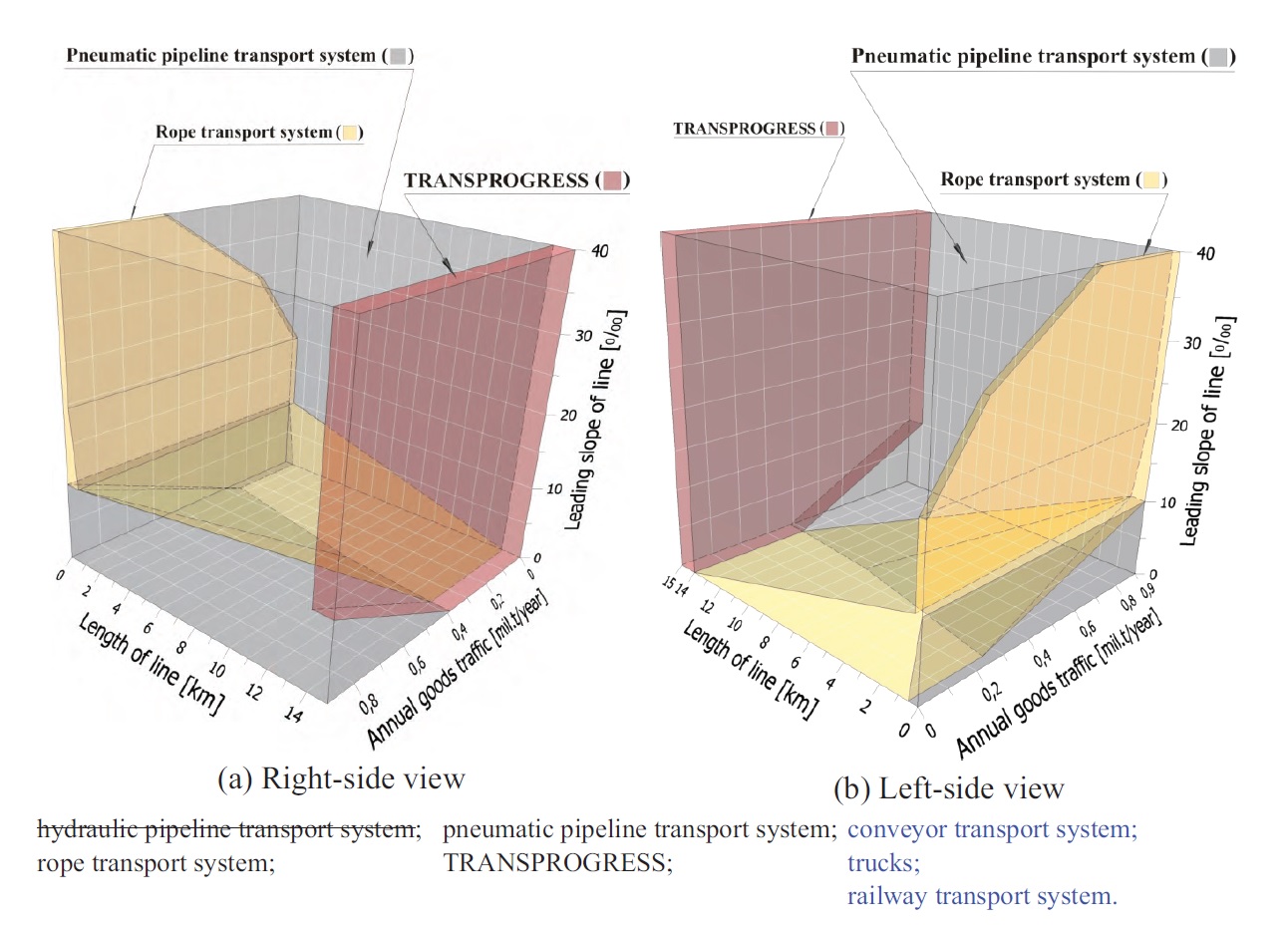 The results of calculations for seven conventional goods transport systems showed that the hydraulic pipeline appeared to be the most effective. After excluding from comparison the hydraulic pipeline transport system, the next effective systems are the TRANSPROGRESS, the rope transport system and the pneumatic-pipeline transport system (Fig. 15). In this case other belt systems appeared not competitive.