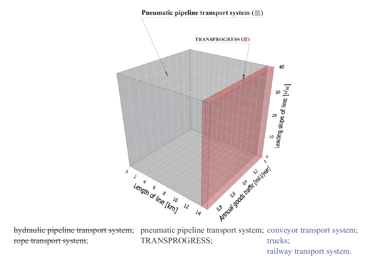 Further for the exposure of scopes of effective application of TRANSPROGRESS, the rope (Fig. 16), pneumatic pipeline (Fig. 17) and conveyor transport systems were consistently excluded from comparison.