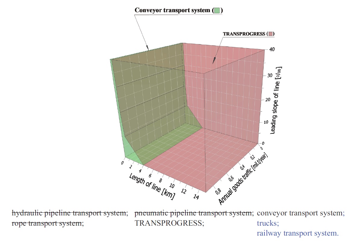 The scopes of effective application of the compared transport systems were determined in 3D co-ordinates, the axes of which correspond to the basic line parameters: length, size of leading slope and annual traffic of goods. Every point in the indicated co-ordinates system corresponds to most effective of compared transport systems.