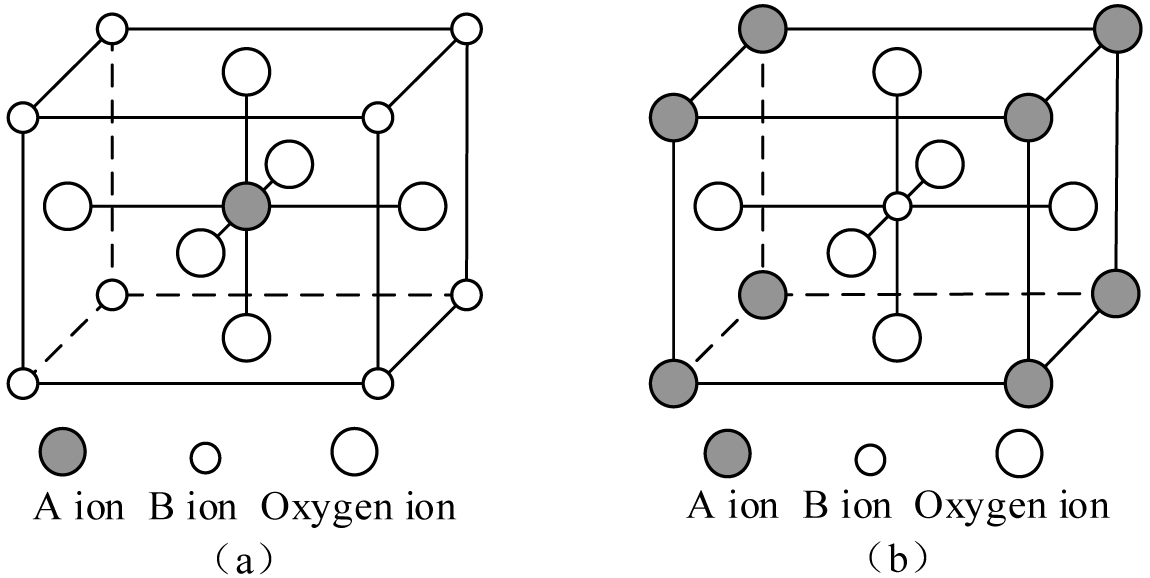 Fig. 1 is a schematic diagram of perovskite structure with two equivalent representations.In fig. (a)the B ion is in the center of the quadrangle of the cube, and the oxygen ion is in the center of the hexagonal surface of the cube; The unit cell in fig.(b) is obtained by moving a distance a/2+ b/2+ c/2)from the unit cell in fig. (a), (a,b,c are the crystal lattice constant ). The A ion is in the center, the B ion is in the four corners of the cube, and the oxygen ion is in the center of the six sides of the cube.