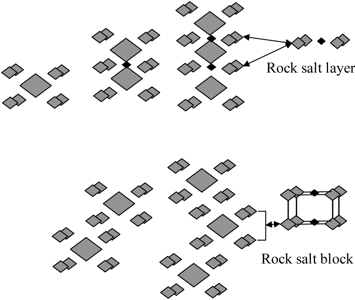 Fig. 2 shows two stacking patterns of perovskite: One is that one perovskite cell is stacked directly on the other, and the two units share the adjacent A-O surface, which is called rock salt layer. Another way is to put perovskite cells on top of the other. The difference is that the two perovskite cells have a displacement of a/2+b/2 to reduce electrostatic repulsion and increase the crystal binding energy. The adjacent A-O planes are no longer shared, which is called rock salt block.