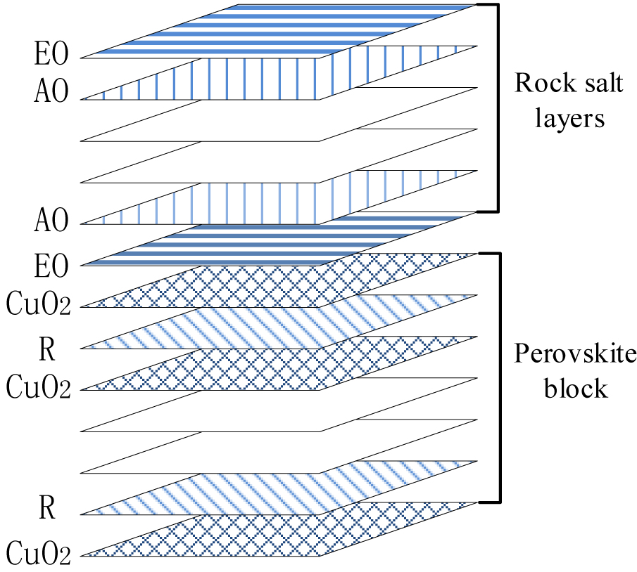 Most high temperature superconductors are stacked in the second mode, which is called R-P structure because it was first proposed by Ruddlesden and Popper. As shown in Fig. 3, the high-temperature superconductor structure is formed by inserting additional layers into the R-P structure, which are often rock salt layers. The general structure can be expressed as AmE2Bn-1CunO2n+m+2 by a four-integer representation (where A, E, R are various metal ions). In the representation of four integers, the m is generally the number of layers in the boundary layer at the junction of two units; the 2 is the number of layers adjacent to perovskite, the vast majority of them are two layers; the n-1 is the number of layers intercalated between copper oxygen surfaces and the n is the number of copper oxygen surfaces. After this representation, the physical images of the layered structure are displayed intuitively (Fig. 3). This layered structure can be seen as consisting of two blockss: (EO)(AO)m(EO) is called the storage reservoir area of electricity storage, also known as rock salt block. (CuO2)[(R)(CuO2)]n-1 is called the conductive zone, also known as a perovskite block.