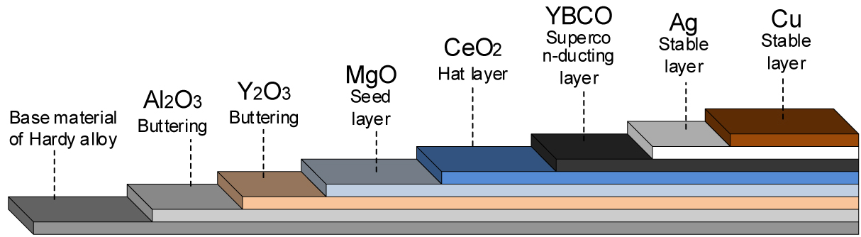 However, the preparation process of YBCO is very complex: firstly, the conductive oxide coating (YBCO layer) is very brittle, the traditional extrusion molding method can not retain its superconducting properties; Secondly, due to the serious problem of weak connection in the YBCO layer, the critical current density of the polycrystal is very low, so it is necessary to eliminate the large angle grain boundary in the current transmission path, which makes it is more difficult in the fabrication process again. The manufacturing process of YBCO is to fabricate YBCO oxide coating on a flexible metal substrate, so YBCO high temperature superconducting material is also called coating conductor.The coating conductor is mainly composed of three parts: textured baseband, transition layer and superconducting layer, in which the manufacturing cost of textured baseband accounts for more than 60 % of the total cost.