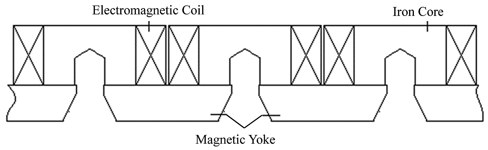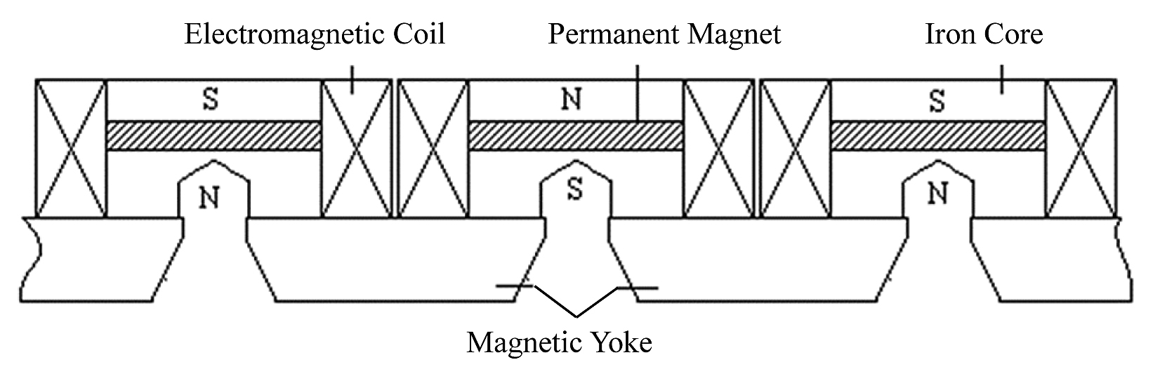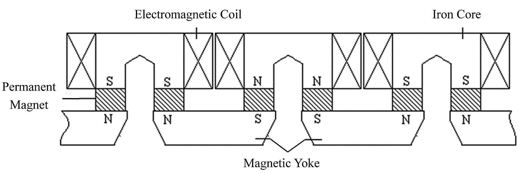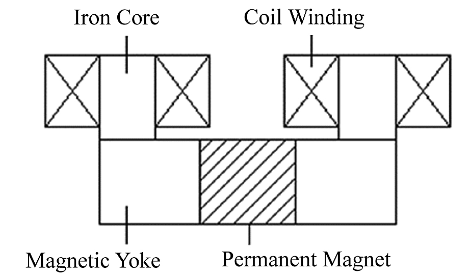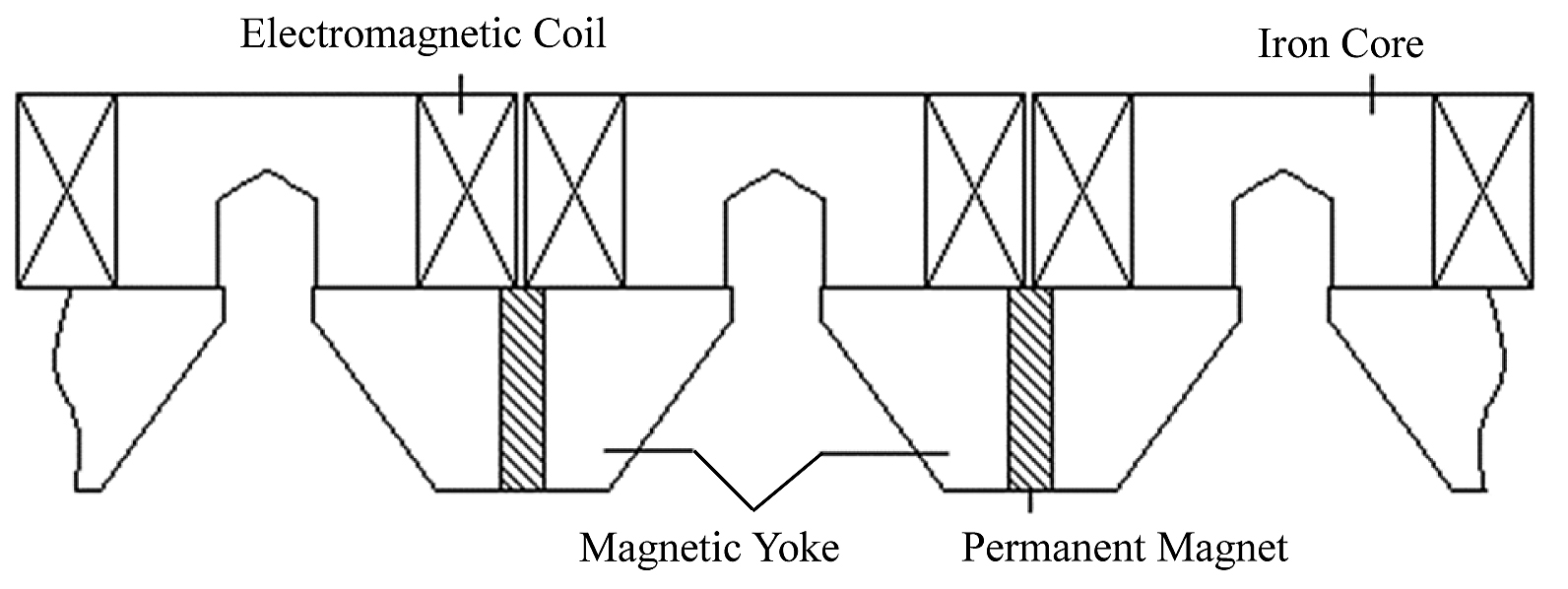 The second scheme: As shown in Fig. 3, the permanent magnet is installed between the iron core and the yoke. In this way, iron cores, electromagnetic coils, and yokes do not need to be changed. However, the polar area of the permanent magnet is small, and it cannot be adjusted flexibly.