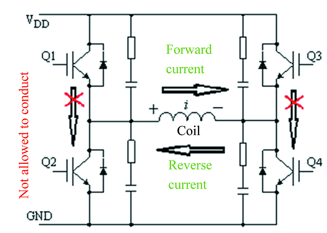 The difference between the hybrid permanent magnet and electromagnet levitation system and the normal electromagnet system is that even if there is no current in the coil, the hybrid electromagnet still has attraction force. Because of the magnetic force of the hybrid electromagnet can make the electromagnet adsorbed on the track when failures occur. As shown in Fig. 6, the bi-directional chopper must be used in the hybrid levitation system, and the chopper drive circuit must be able to output voltage in two directions. The two power switches in the upper part and the lower part of the bi-directional chopper are connected in a branch. In order to avoid direct connection, the opening period of the two devices must have no overlap. In this way, it can avoid the burning of the power components. So the safe and reliable driving of the power switch tube must be solved.