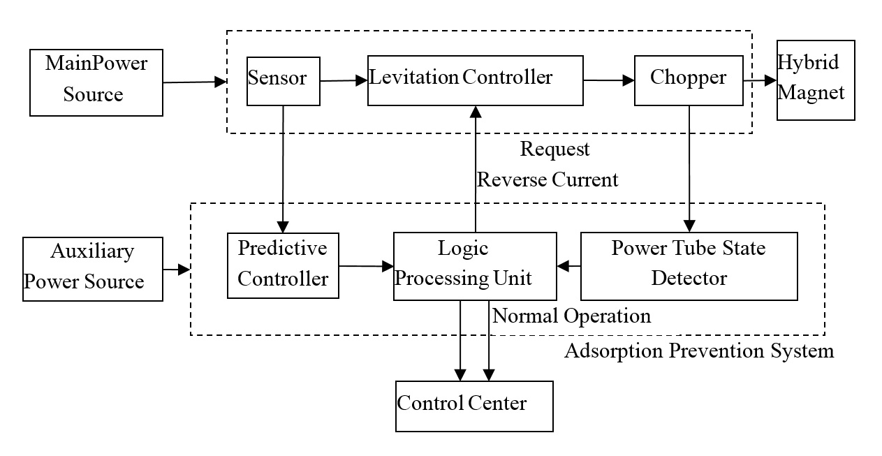 The adsorption prevention system consists of a predictive controller, a power transistor state detector, and a logic processing unit. Under normal circumstances, the adsorption prevention system predicts the gap and monitors the chopper state, and the levitation controller adjusts the current according to the algorithm. When there is a risk of adsorption, the levitation controller outputs the reverse current to reduce the attraction between the magnet and rail track.