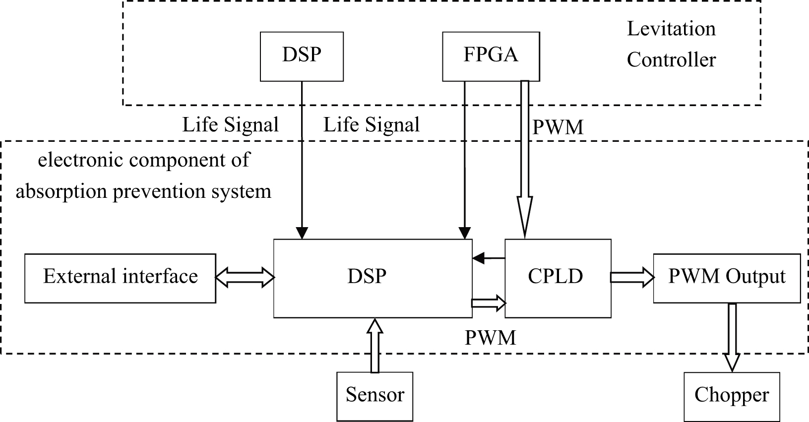 The realization of the adsorption prevention system through the digital circuit is shown in Fig. 8. The DSP predicts the effect of levitation control. When the actual value is quite different from the predicted value, the DSP judges that the levitation control has failed and sends a protection order to the CPLD. The CPLD is used to generate PWM waves and outputs fault-oriented safety PWM.