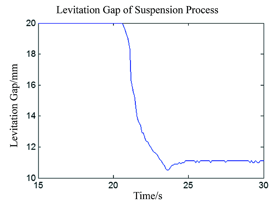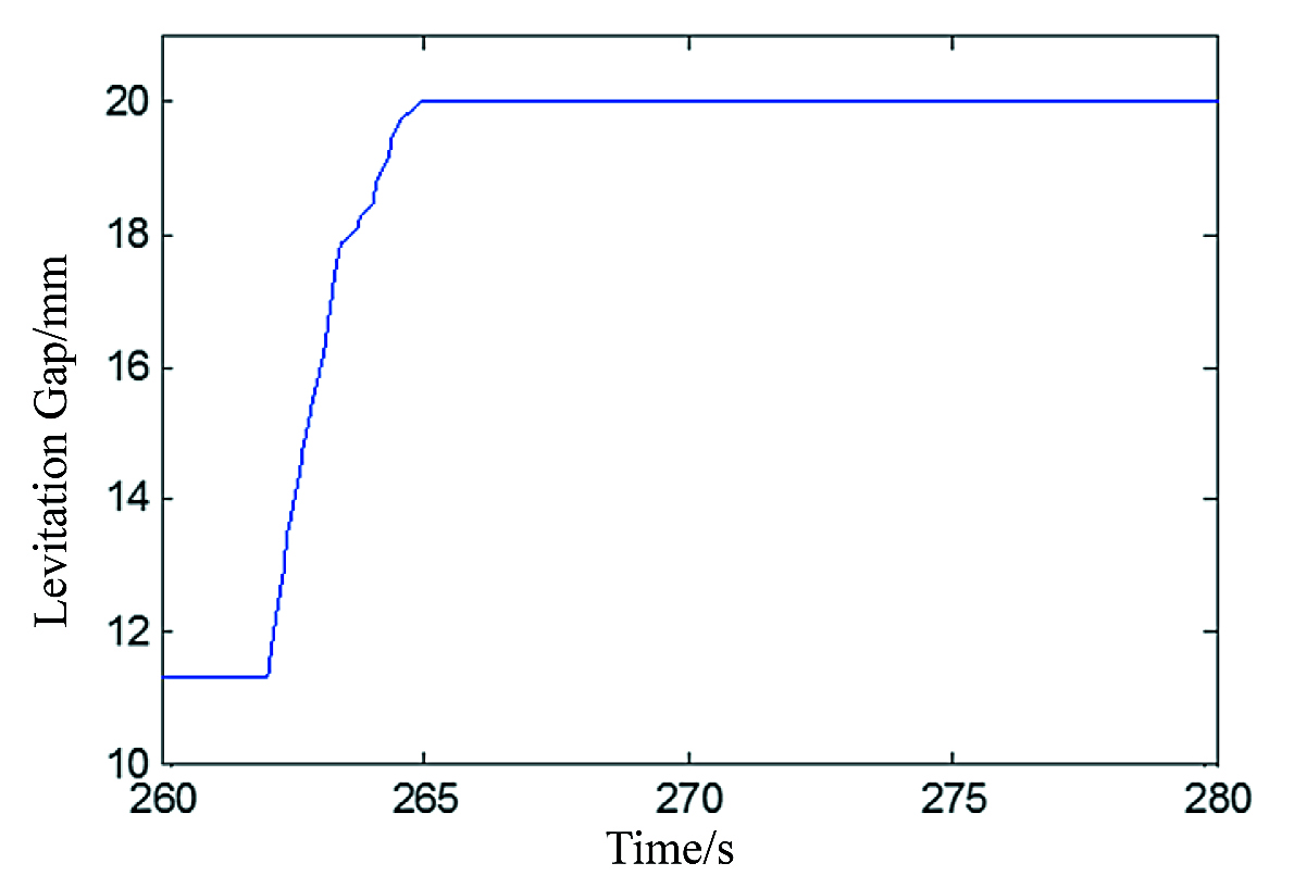 The static levitating and landing test is carried out in the garage. Fig. 9 shows the assembled high-speed maglev train based on hybrid permanent magnet and electromagnet in Shanghai. Fig. 10 shows the experimental result of the maglev suspension. After the levitation command is issued, the levitation electromagnet gradually rises to the target position, meanwhile the levitation gap decreases gradually and keeps at the target value. Fig. 11 shows the test result of the landing process. After the landing command is issued, the electromagnet rapidly falls to the initial position, and the levitation gap gradually increases from the target value to the initial value.