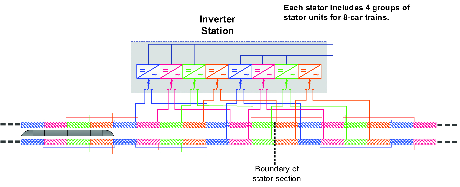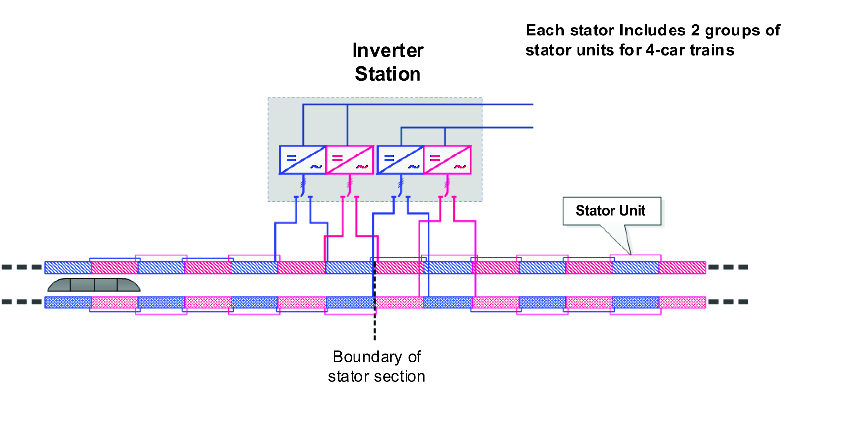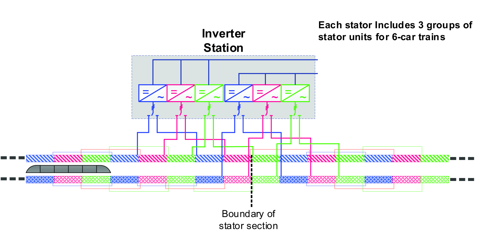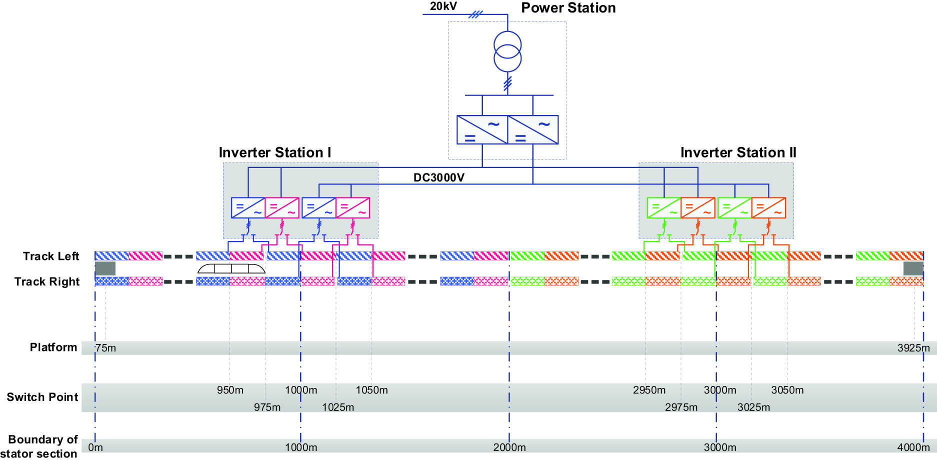 Another important issue that needs to be addressed is about inverters, which are located by the track near the boundary of stator sections, and shared by two adjacent stator sections through the output switches. Compared with the arrangement in Shanghai Maglev Project, this kind of design saves the feeder line cables along the tracks, and thus avoids the voltage drops on the feeder cables. The trackside switch stations now should be called propulsion/inverter stations, for the stator switches are replaced by inverters now. In Fig. 1, Each group of stator units is corresponding to one inverter that is in the same color.