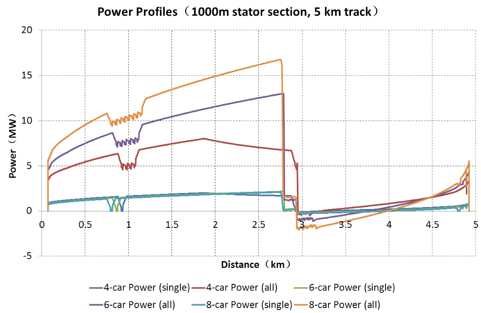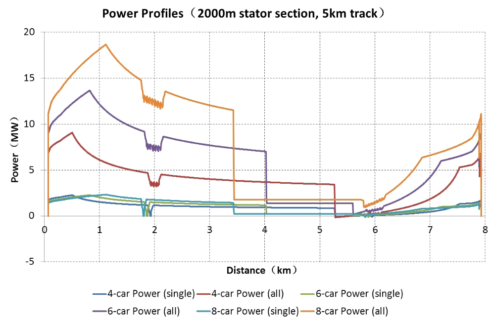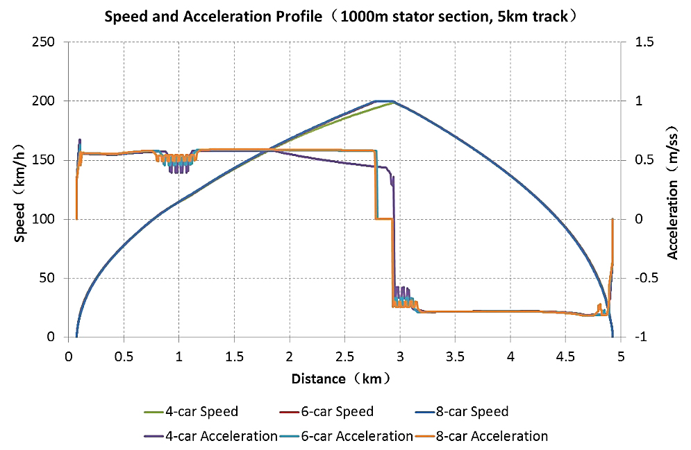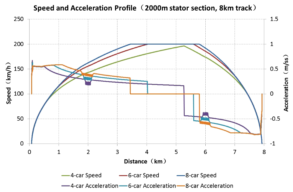 A special feature of the system is that the longer the train is, the more strong acceleration capability the system has. Since for the similar length of the stator section, longer train means shorter stator units group. For example, a 4-car train corresponding to 2 groups of stator units, which indicate one half of the stator section length for each group. While a 8-car train indicate one fourth for each group. This feature is more explicit in 2000 m stator section situation.