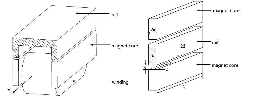 Japanese scholar Yamamura has performed a theoretical analysis on the eddy current effect of the train electromagnet. The analytical solution of the suspension force is given under the conditions that magnetic flux leakage, rail nonlinearity and orbital flux saturation are neglected. Its model and calculation formula are as follows [2]:
