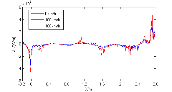 The Jz distribution of lateral density of rail eddy current density at different speeds is shown in Fig. 4. The eddy current density at the two ends of the electromagnet is larger than that of in the middle part of the electromagnet. The eddy current at both ends is in opposite direction and increases with the speed. The peak position at both ends does not vary with speed. The front end of the eddy current is in the negative direction along the Y axis and the back end is in the direction of the Y axis. This indicates that the eddy current weakens the front magnetic field of the electromagnet and strengthens the magnetic field at the end of the electromagnet [5].