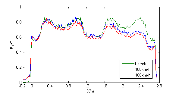 The density of magnetic flux By distribution of the vertical component in the air gap at different speeds is shown in Fig. 5. The By of the electromagnet decreases with increasing eddy current in the front of the air gap, and the By changes very little at the end. Comparing the air gap flux density at different speed, it indicates that the average magnetic flux density is smaller in the air gap when the velocity is larger. The decrease of the air gap means that flux density will directly reduce levitation force. The higher the speed of the electromagnet, the more significant the effect of eddy current, the more the lead force is reduced [5].