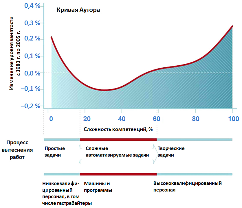 It is seen that, for a period of 25 years in USA the employment degree of low and highly-qualified employees increased, and the number of middle qualification workers decreased. This was caused by widespread use of automated solutions for medium-level tasks. The automation in any industry always starts with middle qualification works, since they contain a sufficient volume of template operations which are easy to automate, and they are paid good enough to make this process attractive for business owners.
