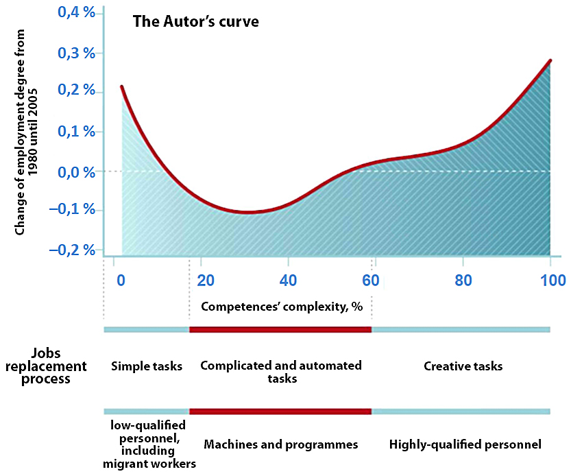 Another important tendency of the past decades cannot be omitted. Today, the highest impact of digitalisation and automation is made on blue-collar and middle specialists. To confirm this, let us consider the Autor’s curve (presented by American economist David Autor), which reflects alterations in employment rate in USA industry from 1980 until 2005, depending on an employee’s qualification (Fig. 3).