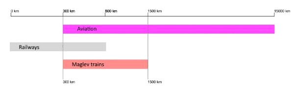 Aviation can be the most competitive means of transport, for distances greater than 1500 km, when compared to high-speed railway. However, with magnetic levitation, for speeds between 450 and 600 km/h, it could be a competitive option to aviation, up to distances of 2000 km. In conclusive terms, there is a very competitive space between high-speed railway and aviation, which can serve very well magnetic levitation, between 300 km and 1500 km.