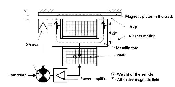 This system emerged in the 1970s when Transrapid's German trains used the pulling forces between electromagnets and ferromagnetic bars that are controlled individually and electronically and levitate the vehicle. These electromagnets are in the vehicle and the ferromagnetic bars of the rails. The next image demonstrates a scheme of the levitation system used in Transrapid.