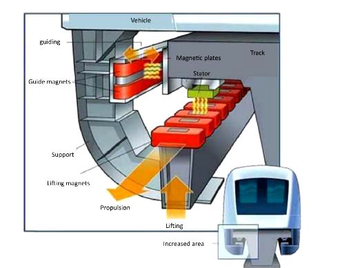 The interaction between the superconducting coils in the vehicle and the coils on the rail creates a strong magnetic field that is induced by the superconducting coils of the vehicle, which causes the coils on the rails to undergo polarity inversion, creating repulsive forces that levitate the vehicle. The coils on the rails are passive, non-superconducting, and have an "8" configuration, which causes the current induced by the coils in the vehicle to cause a simultaneous force that pulls the vehicle upward and pushes it down.