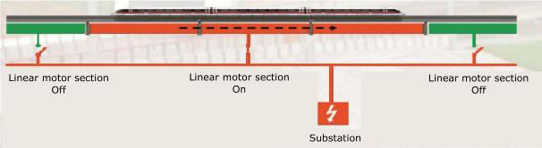 The propulsion system used is the synchronized linear stator motor, which is used for the propulsion and braking of the vehicle. This motor is also referred to as LMS – linear motor stator. This motor thus creates a magnetic field, which when interacting as the support magnets in the vehicle arm create forces of attraction impelling the movement of the vehicle. The magnetic field is achieved by induction of a three-phase alternating current, the speed of the vehicle is controlled by the frequency of that same alternating current of the linear motor. Braking the vehicle is achieved by changing the direction of the magnetic field, there being no physical contact between the two sides of the engine. The linear long stator motor installed in the rails is divided into sections, these being fed by the electric current only when the vehicle is in the section in question. To do this, substations with different powers are required according to the track layout, since they can be traced that require considerable braking and large accelerations of the propulsion system, a situation that requires a greater power of the electric network, compared to the traces of the track in which the journey is constant.