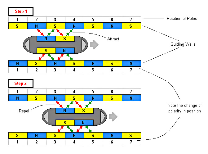 The propulsion coils located on the sides of the rails are fed by a three-phase electric substation, creating the polarity variation that will give rise to the magnetic field that drives the vehicle when they come into contact with the superconductors in the vehicle. The movement of the vehicle is carried out by alternating polarity in the lateral coils of the rails, as can be seen in next figure. The lateral coils on the left and right side of the rail alternates the polarity, thus provoking forces of attraction or repulsion forces, in the superconductors on the side of the vehicle, impelling the movement [6, 8].
