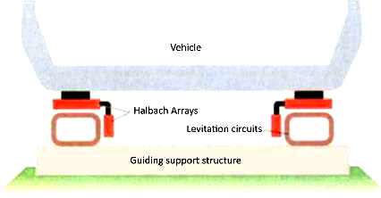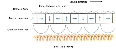 This vehicle with the Inductrack system when it is built will require four Halbach Arrangements, over a series of levitation circuits consisting of Litz wires. Two of the Halbach Arrays are positioned down over the circuits if they have the levitation function while the other two Halbach Arrays are positioned sideways in relation to the circuits to balance the vehicle to maintain it, as it can be seen in next image [16].