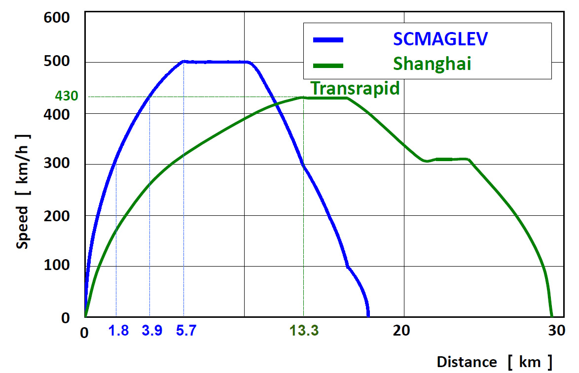 Levitation systems achieve high speeds over a shorter distance when compared to high-speed railway systems. Magnetic levitation vehicles can achieve better acceleration and braking performance over shorter distances than the high-speed rail, about 1/5 of the stroke length.