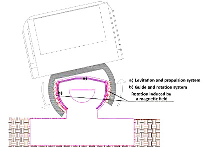 In order for this system to work, it is suggested that a further magnetic field be introduced on the track, in addition to the propellers and guidance, which is to rotate the vehicle in a curve and to replace the superelevation of the conventional rail. This rotation in addition to the existing advantages in the construction process, also has the advantage of the vehicle adjusting the rotation according to the speed at which it travels, ensuring the best comfort for the passengers. The proposed system has, as with other magnetic levitation systems, lateral guiding forces, lift forces, propulsion forces, but also rotational forces that are only required in a curve. These magnetic forces are arranged on the rail which interact with the magnets in the vehicle as can be seen in the following figure.